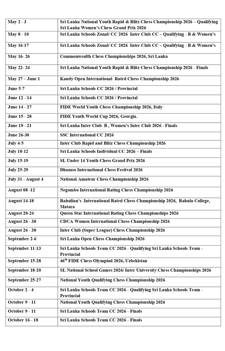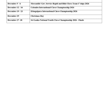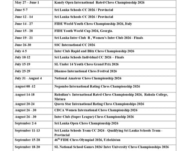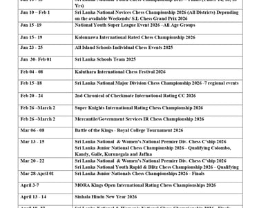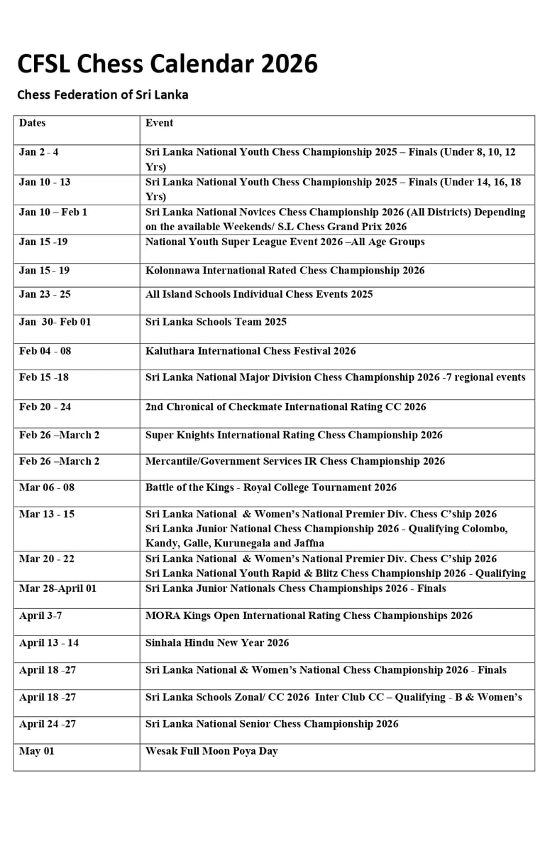 Stay updated with the Chess Federation of Sri Lanka Calendar 2026. Discover official chess events, national tournaments, and championship dates across Sri Lanka for 2026.