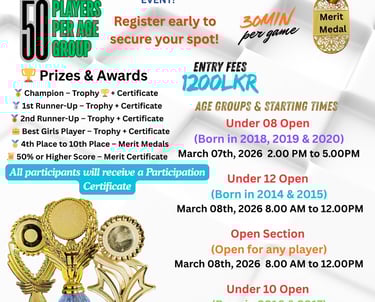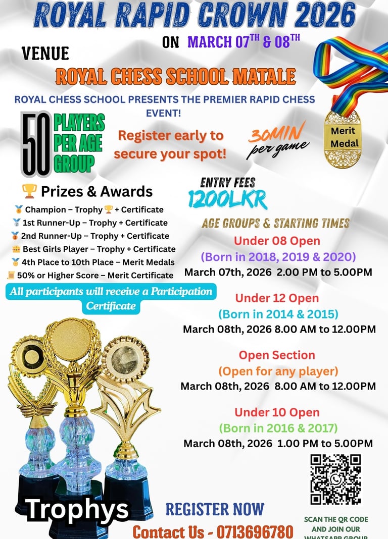 👉 Commercial Bank: Royal Chess School PVT LTD | Account No.: 1000837672 | Branch: Kandy